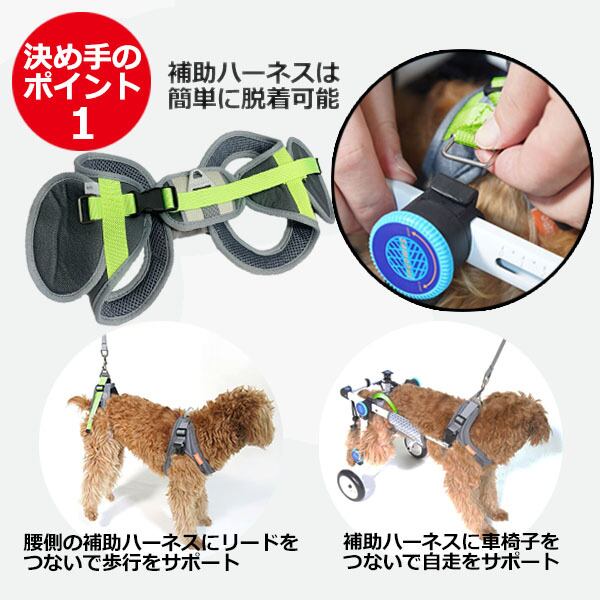 ・胸腹部を支える補助ベルト付きが大きなポイント!ワンちゃんの腰への負担が軽減し、ストレスなく補助輪に慣れてもらえます。